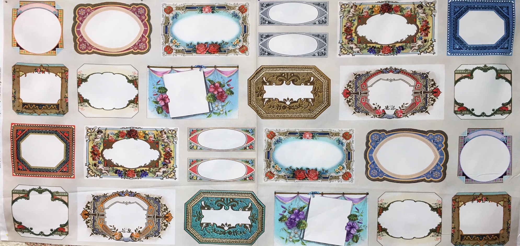 55cm x 110cm piece containing one full pattern repeat as pictured (26 labels of varying sizes)